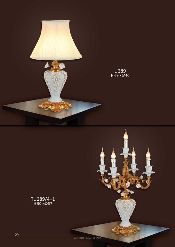 Đây là trang 54 catalogue MAHDI LUSTER IND, tiếp tục bộ sưu tập 289 với 2 mẫu đèn bàn cao cấp. Vẫn giữ ngôn ngữ thiết kế sứ trắng đắp hoa + mạ vàng đặc trưng.