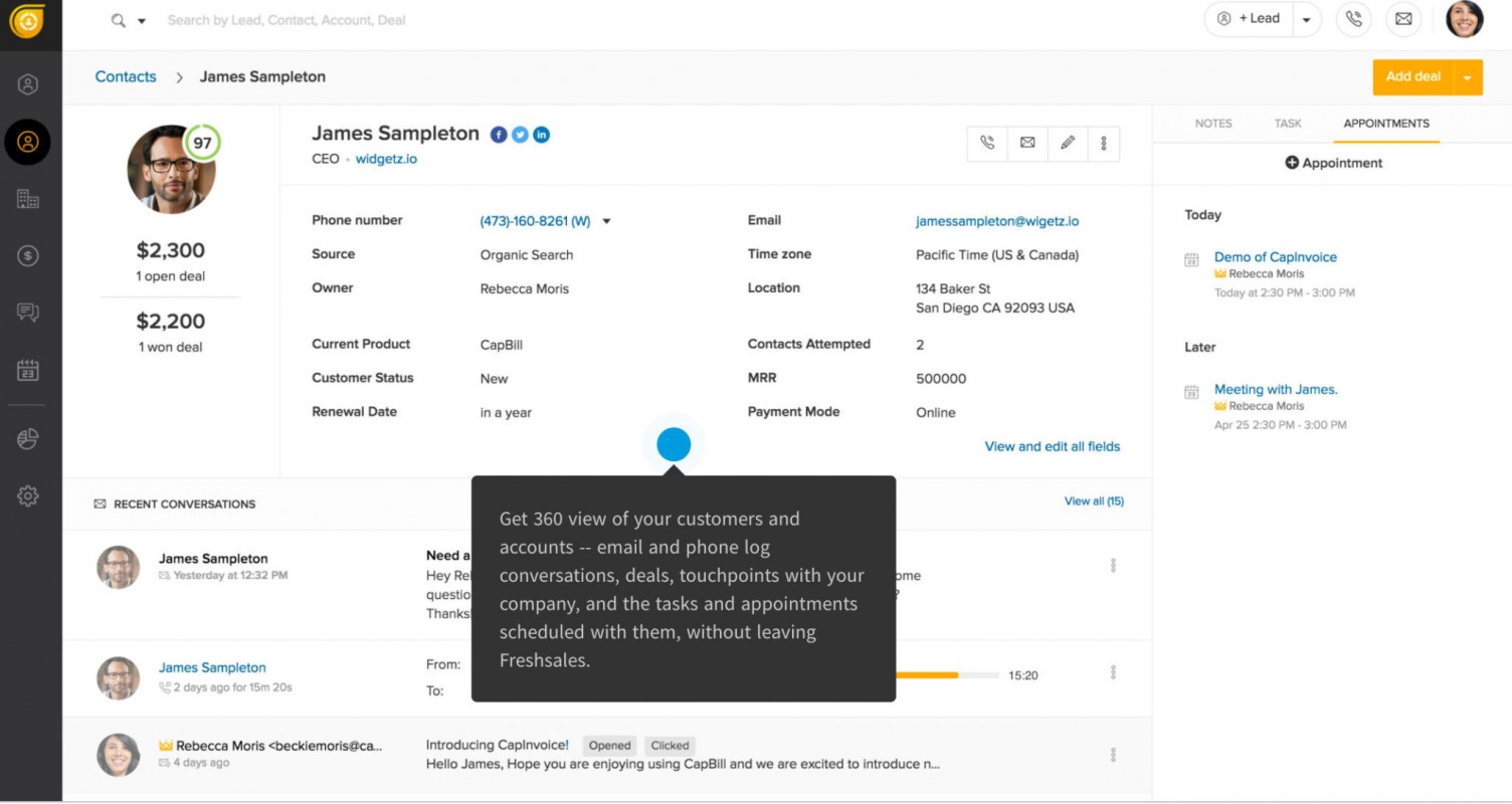Phần mềm chăm sóc khách hàng miễn phí Freshworks CRM là phần mềm CRM miễn phí có khởi nguồn từ Ấn Độ từ năm 2010. Cũng tương tự như nhiều đơn vị cung cấp giải pháp khác, một số tính năng của Freshworks CRM chỉ dành cho các gói cao cấp hơn, ví dụ: thiết lập quy trình làm việc theo thời gian, báo cáo số liệu nâng cao, chatbot…