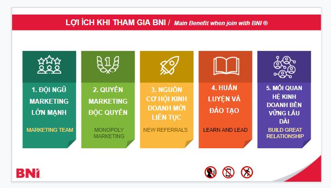 Tham gia vào BNI bạn sẽ được huấn luyện phương pháp và sử dụng hệ thống toàn cầu nhằm tạo ra nhiều cơ hội kinh doanh hơn để tăng doanh số và lợi nhuận. Những yếu tố này là động lực cho những người sáng lập BNI Việt Nam cũng như thành viên BNI Việt Nam đang hoạt động tích cực để mang đến cho doanh nhân Việt Nam một cách thức mới để phát triển kinh doanh.