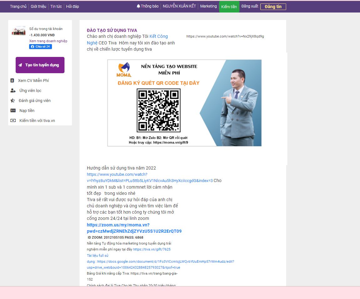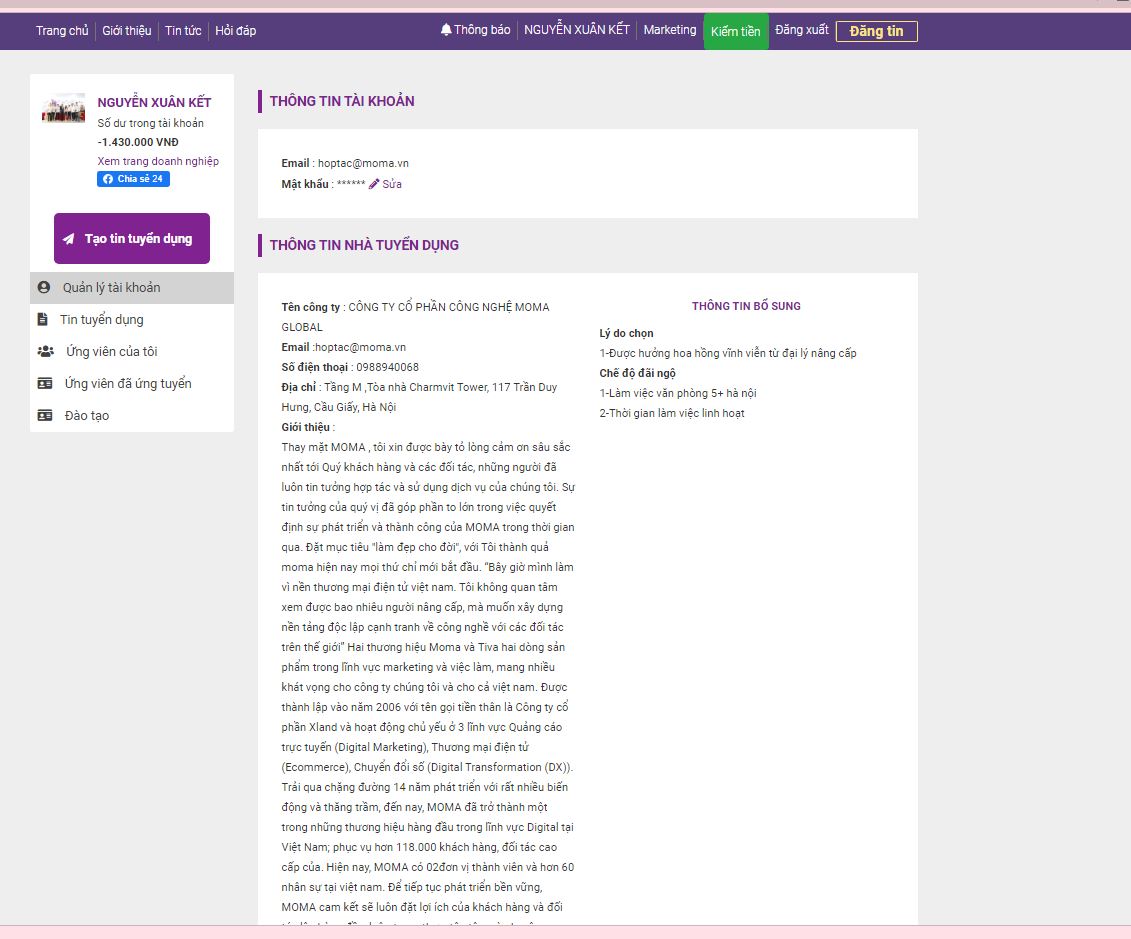 Chào các anh chị chủ doanh nghiệp ngoài nền tảng Moma.vn tạo website marketing miễn phí thì công ty mmo global còn có nền tảng tuyển dụng tiva.vn số 1 hiện nay về cung cấp ứng viên miễn phí. Mỗi ngày nhà tuyển dụng có 5 ứng viên chất lượng cao hoàn toàn miễn phí