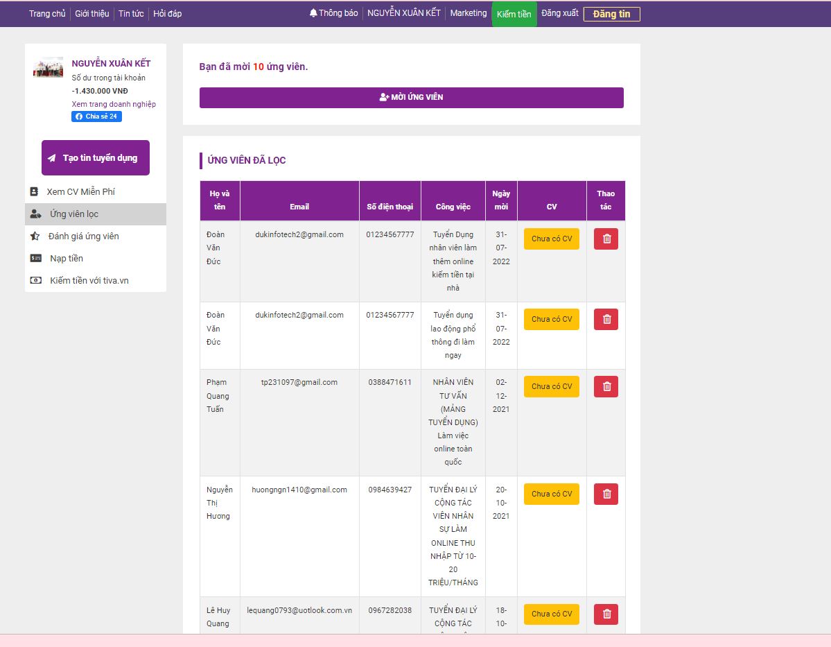 - ứng viên đã lọc tuyển dụng