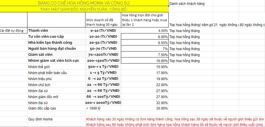 Nguồn thu từ CTV= Doanh số bán hàng từ nhiều công ty + Doanh số giới thiệu người mua hàng ( hoa hồng vĩnh viễn) + Doanh số Giới Thiệu Moma